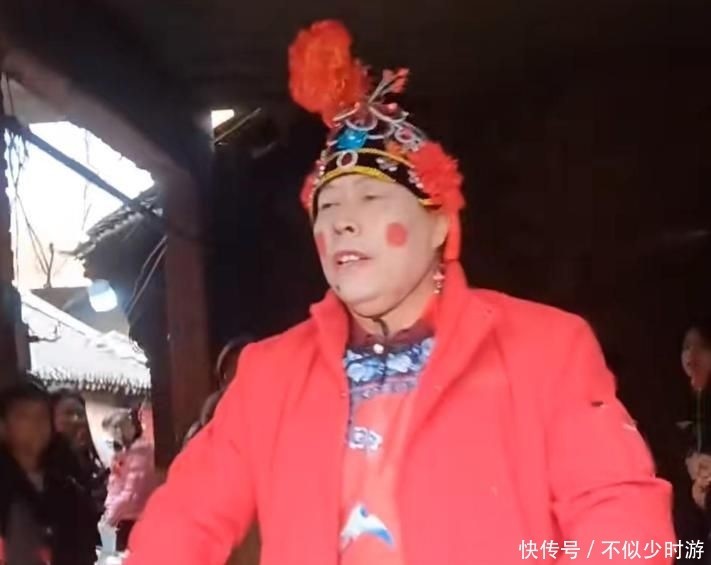 他穿上花哨衣裳,头戴绒球帽,手执红绢,一口地道方言顺口溜张口就来,幽默风趣又不失温情,总能把现场气氛推向高潮。